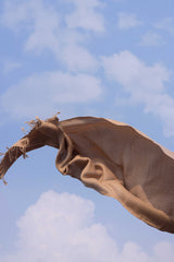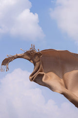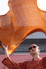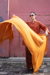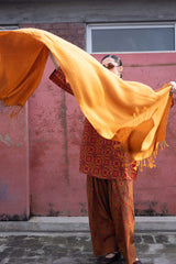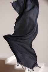 A soft woven shawl, designed for warmth and comfort, finished with loose thread edges for a subtle touch of charm.