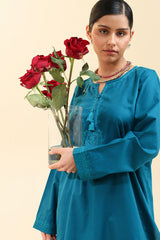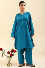 Textured classic-fit paneled shirt featuring self-embroidered detailing along the neckline and sleeve hems, accented with tassel detailing along the front slit. Finished with a rounded shirt hem. Paired with a textured classic-fit shalwar.
