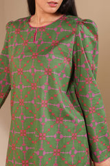 A classic-fit printed shirt with a round neckline and V-slit, adorned with dori detailing on the neckline and sleeve hems. Paired with a matching printed classic-fit shalwar.